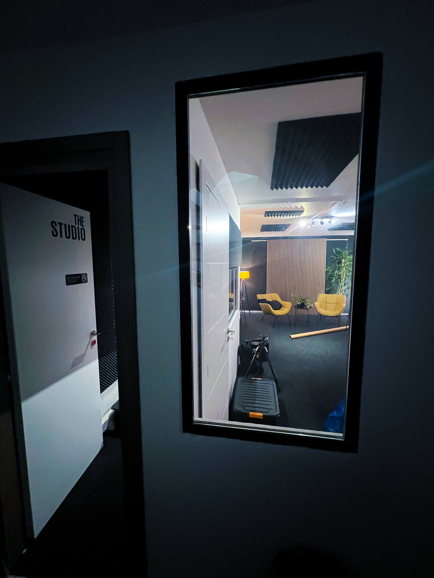 Το μικρό booth του studio λειτουργεί και ως control room και ως χώρος voice recording.Πλήρως ντυμένο με ρικοφόν, προσφέρει καθαρό, στεγνό και επαγγελματικό ήχο.